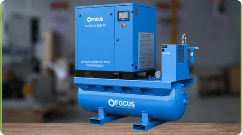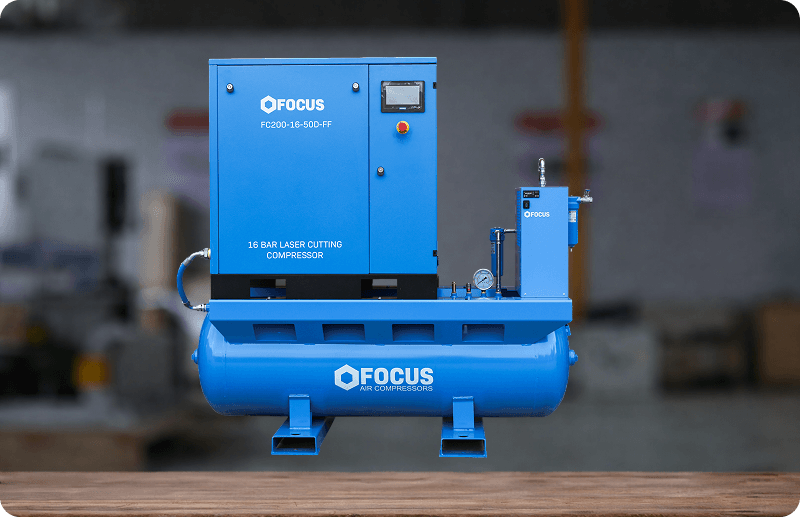 The Focus Chieftain Fixed Speed Rotary Screw Compressor is the pinnacle of laser air cutting systems. Available in 15 kW and 22 kW configurations, each system comes complete with a 500 L high-pressure tank, integrated refrigerated dryer, and 3-stage inline filtration — everything you need to replace nitrogen, pre-commissioned and ready to connect.